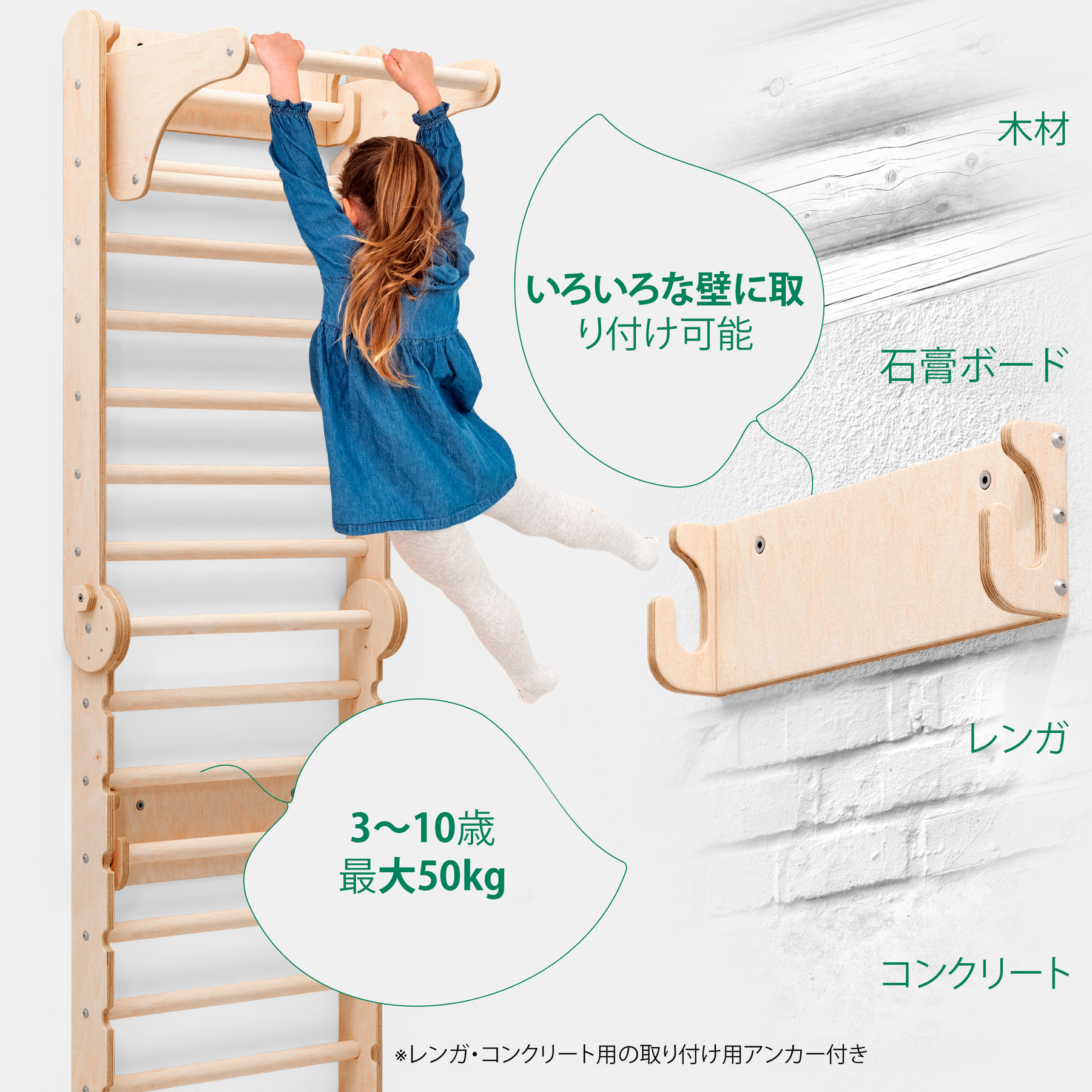 Goodevasのスウェーデンラダーは、ご家庭でお子さまの成長を支えるのに最適です。頑丈な天然木を使い、お子様が安心できるオーガニック素材で仕上げ、表面は職人の手で丁寧に磨いています。1〜7歳から、もっと大きくなっても長くお使いいただけます。バー遊びは、登ったり伸びたりぶら下がったりしながら体の成長を育みます。筋力や運動能力も自然に伸び、遊びが毎日の健康習慣になります。