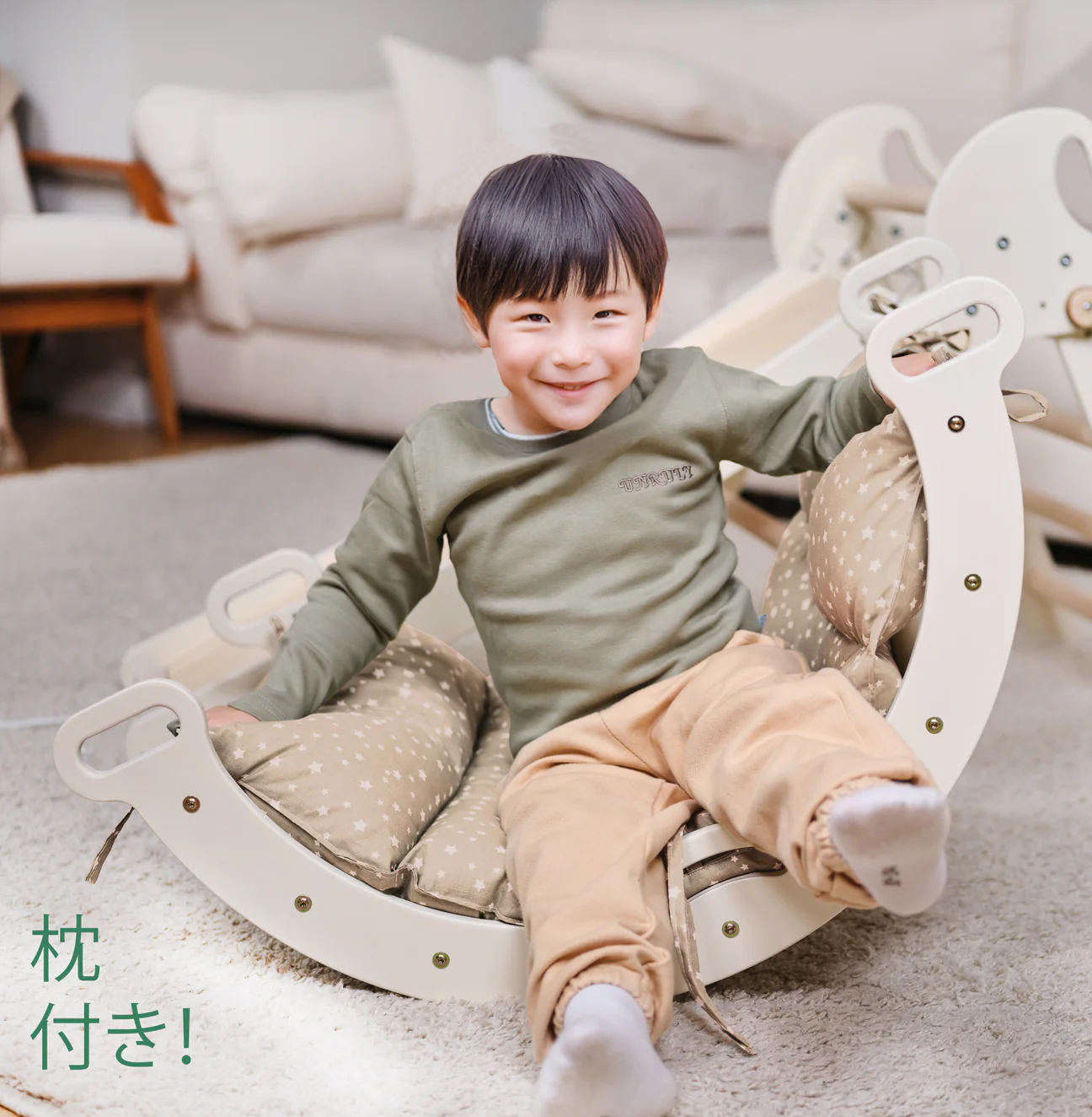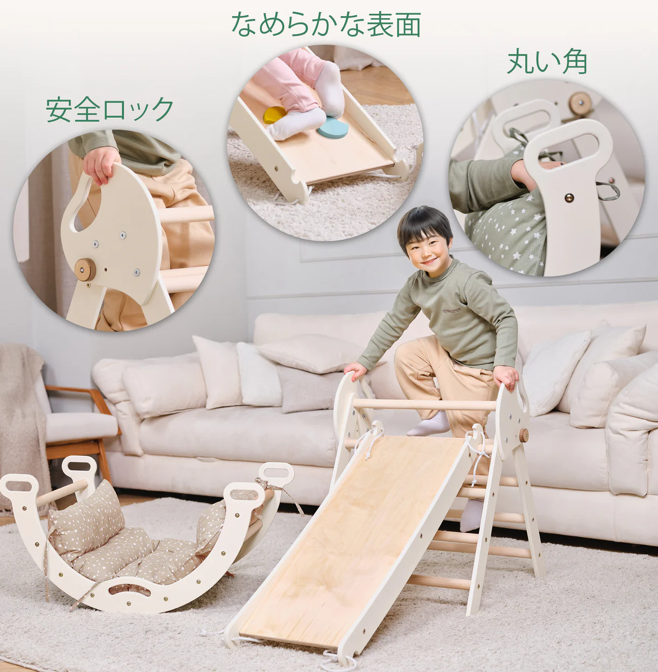 セットにはお子様が存分に遊べる要素が全部そろっています。ピクラートライアングル・クライミングアーチ・滑り台ボード・やわらかいクッション。コンパクトなサイズのおかげで、小さなアパートにも違和感なく設置いただけます。遊び終わったら、簡単に折りたたんでスッキリ収納できます。お子様に安全な天然素材で作られており、丈夫さと美しさを両立し、どんなお部屋にもぴったりです。