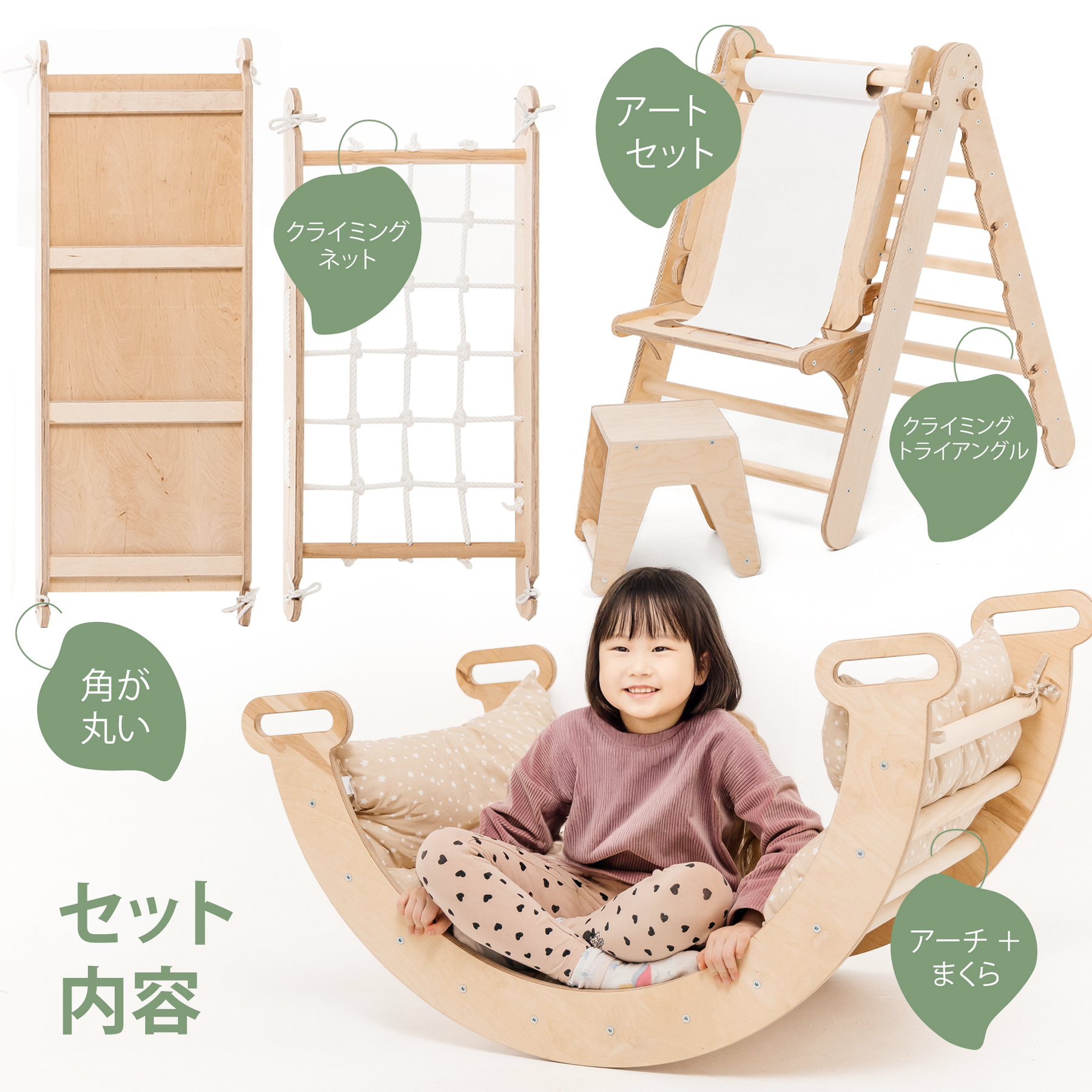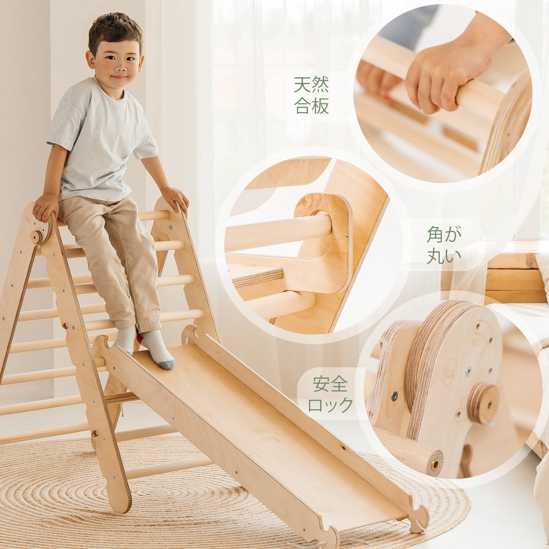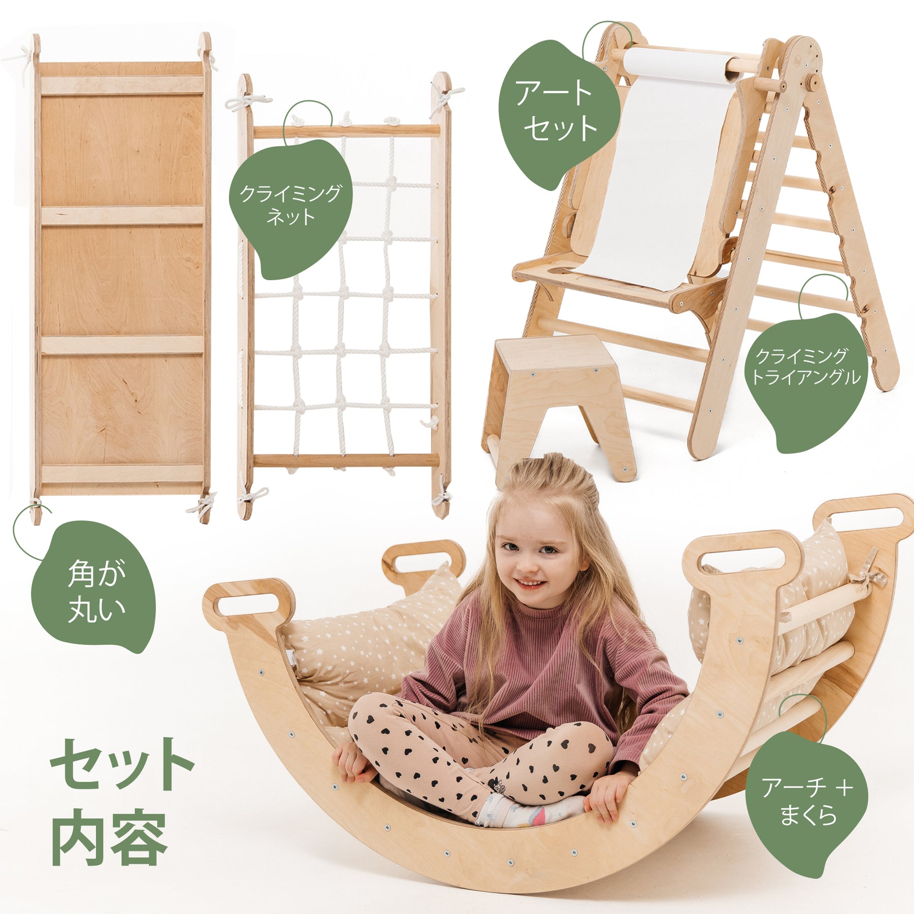 6-in-1 クライミングセットをご紹介します。運動の大切さを重視するモンテッソーリ教育の理念を取り入れ、お子様の全人的な成長を促します。この多彩なセットは、お子様の勇気・手と目の協応・筋力・バランス感覚、そして緻密な運動能力を育みます。1~7歳ごろ向けのこの多用途遊具は、お子様が安全に遊びながら、想像力を高める環境を作ります。