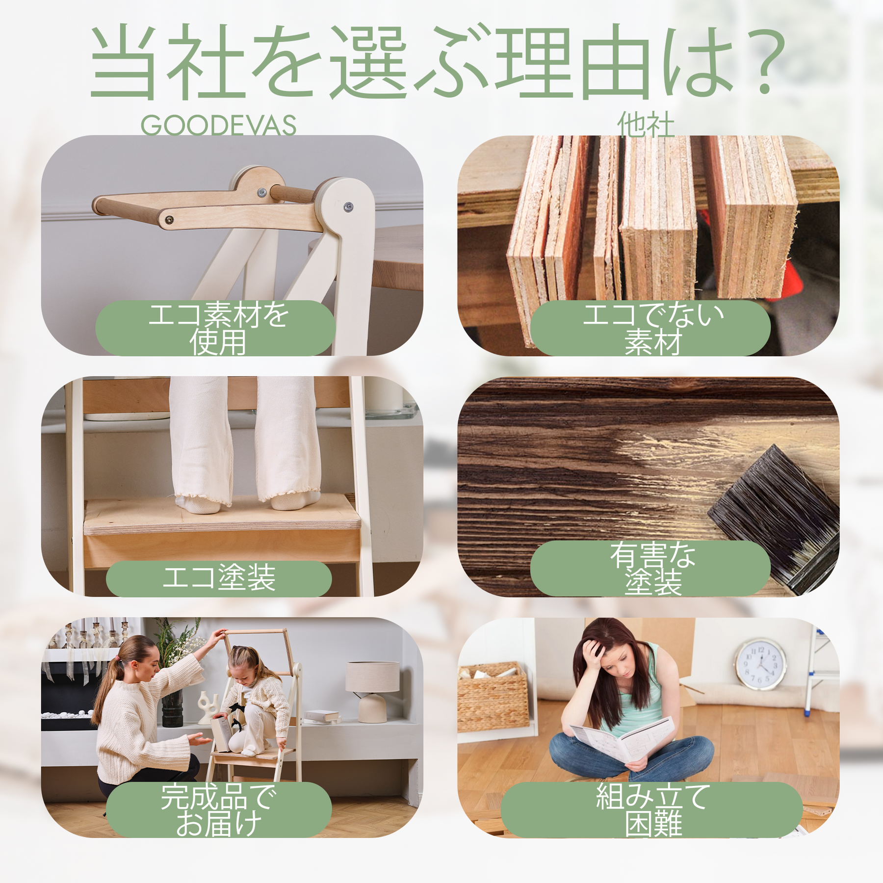 高品質で環境にやさしい素材を採用し、お子様の安全と成長を第一に考えた設計にしています。さらに、当社製品はすべてバーチ合板で作られ、ポプラ合板と比べて30〜40%高い強度を誇ります。生産はヨーロッパの基準に従って行っていて、その分価格にも反映されています。