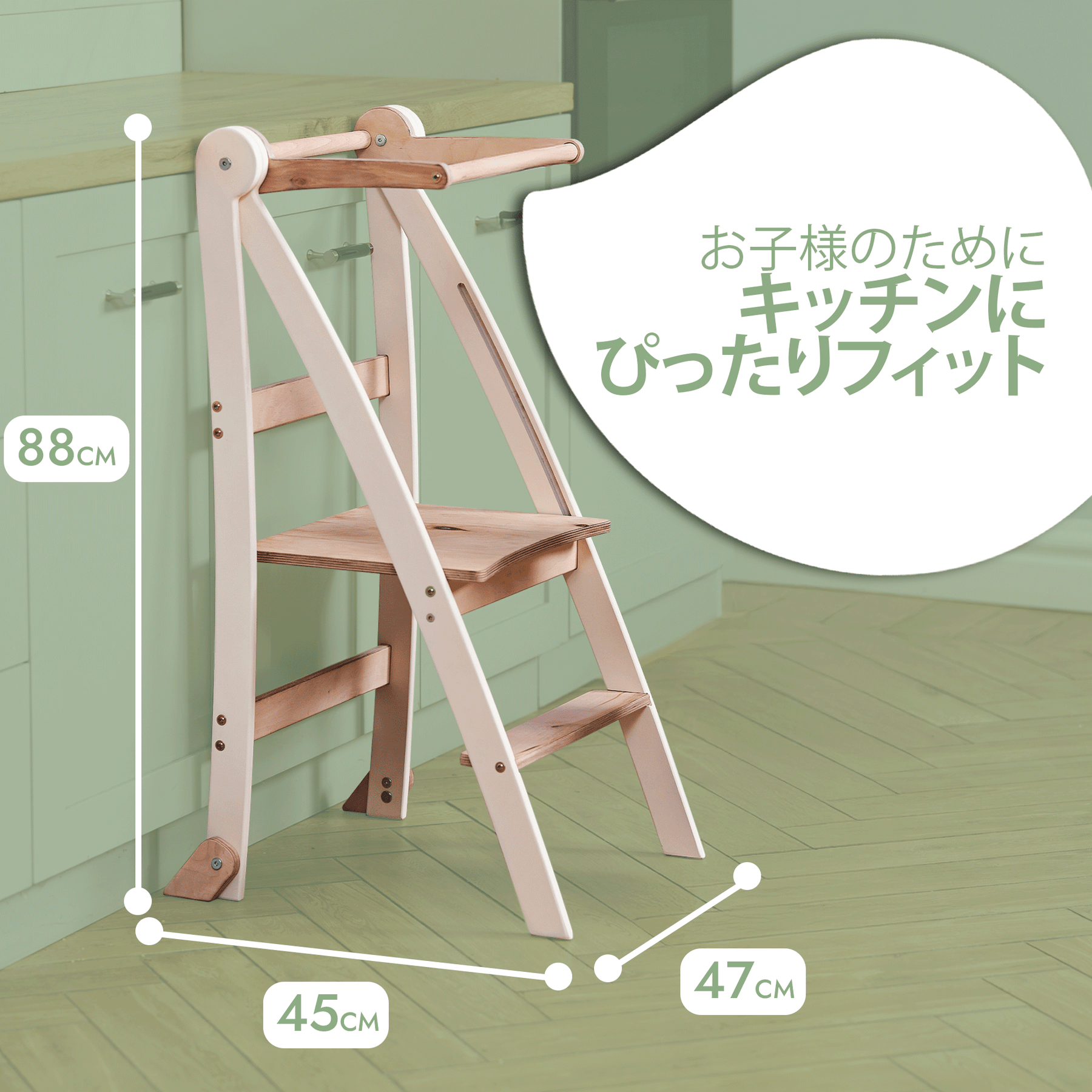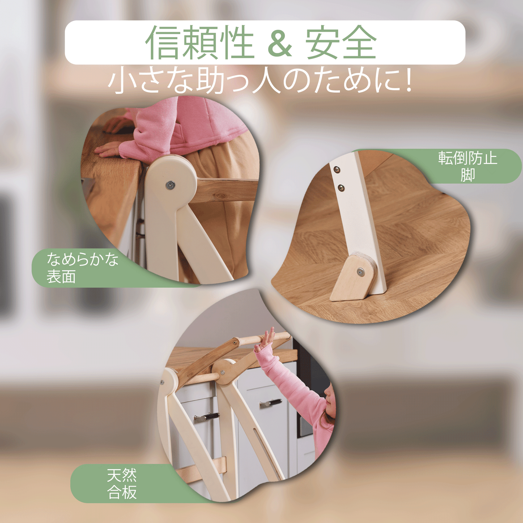 忙しい保護者の方と、元気いっぱいの小さな探検家におすすめです。折りたたみ式で便利なステップスツールは、使いやすさと実用性を兼ね備えています。スペースが必要なときも、さっと準備したいときも、スマートな設計で収納も使用もらくらくです。